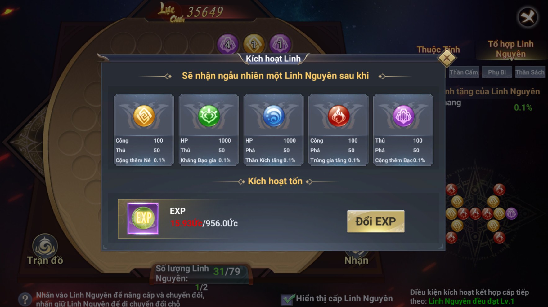 - Trong cùng một trận đồ, mỗi loại tổ hợp Linh Nguyên giống nhau chỉ có hiệu lực tối đa 1 cái. Sau khi trận đồ hiện tại đã lấp đầy, có thể tiêu hao đạo cụ để mở rộng thêm trận đồ mới; trận đồ mới cần phải thu thập lại Linh Nguyên từ đầu.