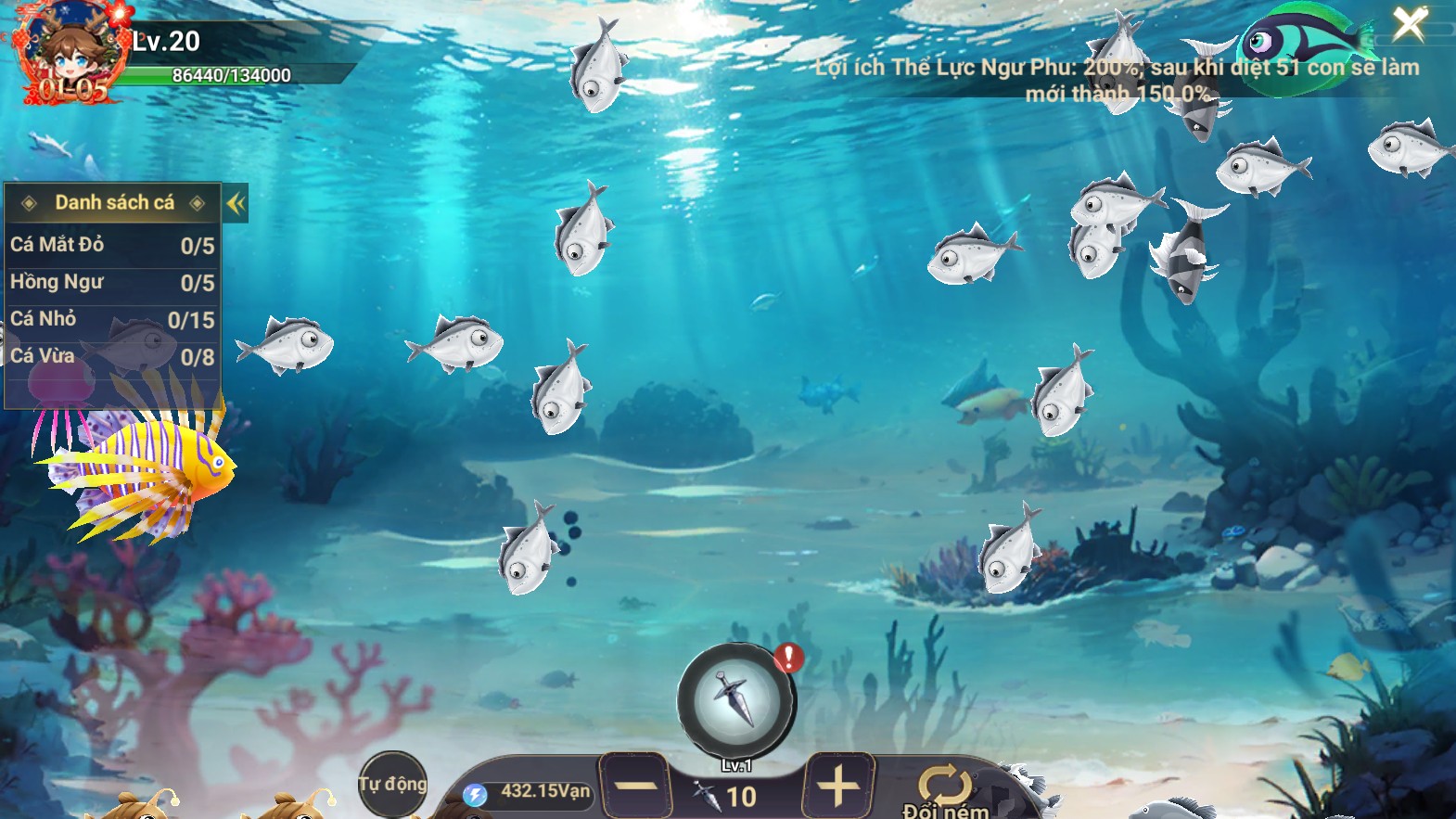 - Hoàn thành nhiệm vụ để tăng cấp đánh cá, khai mở 3 Ngư Trường lớn với nhiều loài cá hiếm khác nhau!