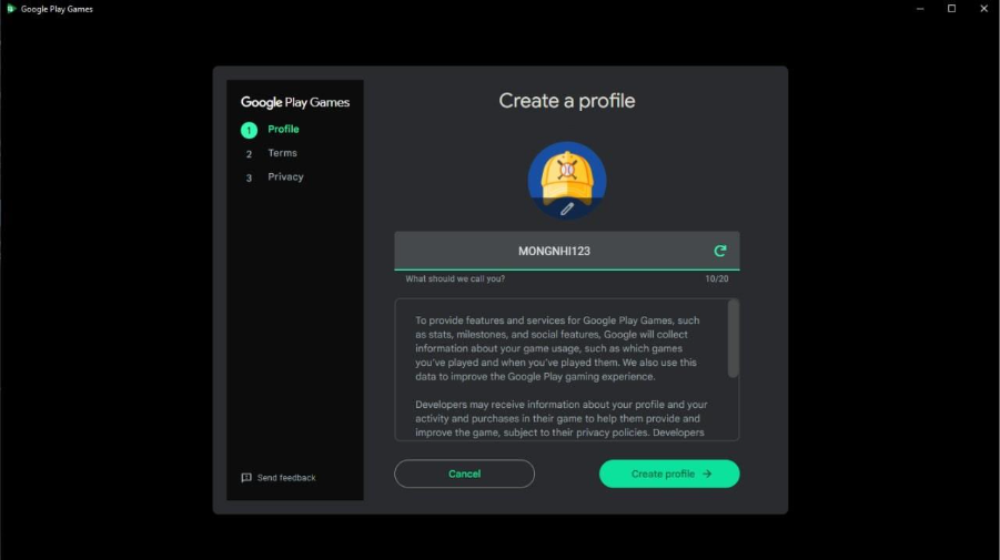 Bước 4: Sau khi đăng nhập, Tiên Hữu đăng kí thông tin hiển thị trên ứng dụng Google Play Games nhé.