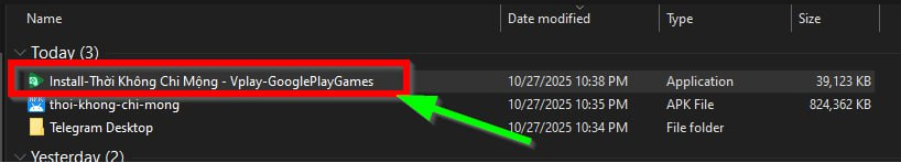 Bước 3: Mở file cài đặt Thời Không Chi Mộng - Vplay-GooglePlayGame để bắt đầu cài đặt vào máy tính